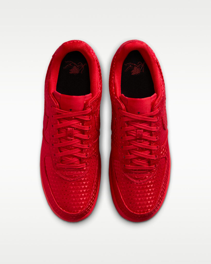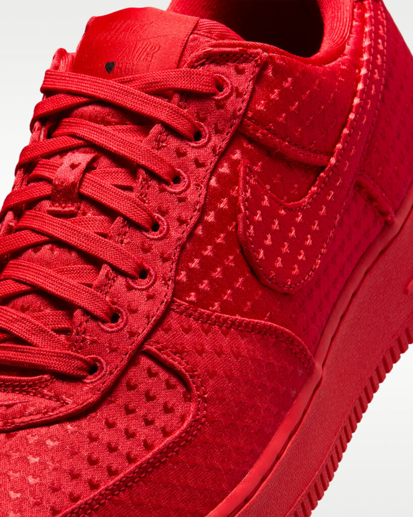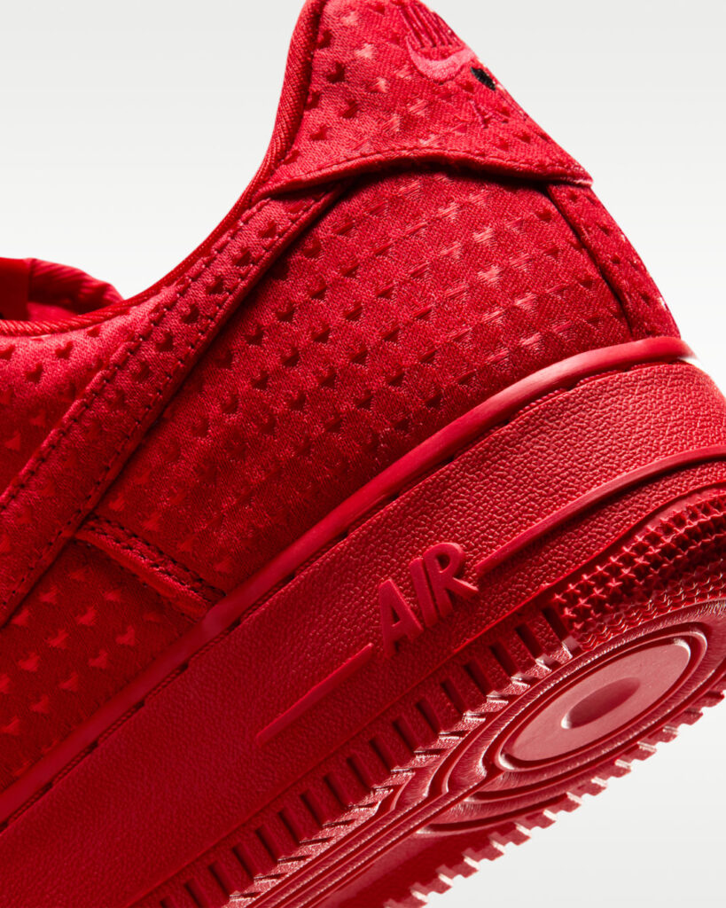 At first glance, the sneaker commands attention with a full monochromatic University Red treatment. Departing from the traditional leather upper, the AF1 Retro opts for a textured textile material drenched in vibrant red. The standout detail? An all-over heart motif woven delicately into the fabric. Unlike oversized graphics that overpower the shoe, these repeating hearts are subtle, playful, and add a romantic touch without disrupting the iconic AF1 silhouette. It’s understated romance—love at first step, with just enough charm to spark compliments.